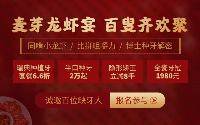 如果您正饱受缺牙困扰或存在活动假牙佩戴不适,烤瓷牙修复失败等情况,亦或是想更进一步了解种牙知识,点击下方快速预约,报名参与第五期麦芽百叟龙虾宴,即享硕博领衔专家智库亲诊机会,听种牙人现身分享缺牙重生的故事,符合条件者还可申领价值3500元的种牙援助,特价种牙省更多!