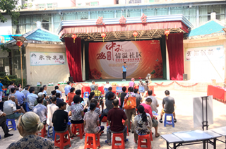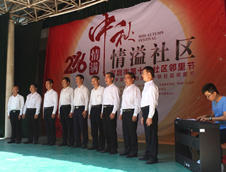 活动在10点正式开始,一位男歌手的男高音演唱吸引了众多社区居民驻足欣赏。