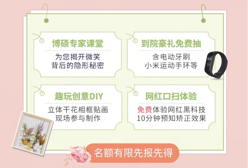 趣玩创意DIY手作,体验矫正黑科技网红口扫仪,个性化设计专业矫正方案,最后更有极具诱惑的矫正特惠等福利,机会错过不再来,预约报名参与吧!活动惊喜多多,好礼送不停。签到礼、消费礼、抽奖礼、互动礼、矫牙礼、红包礼多重豪礼,您来就送!