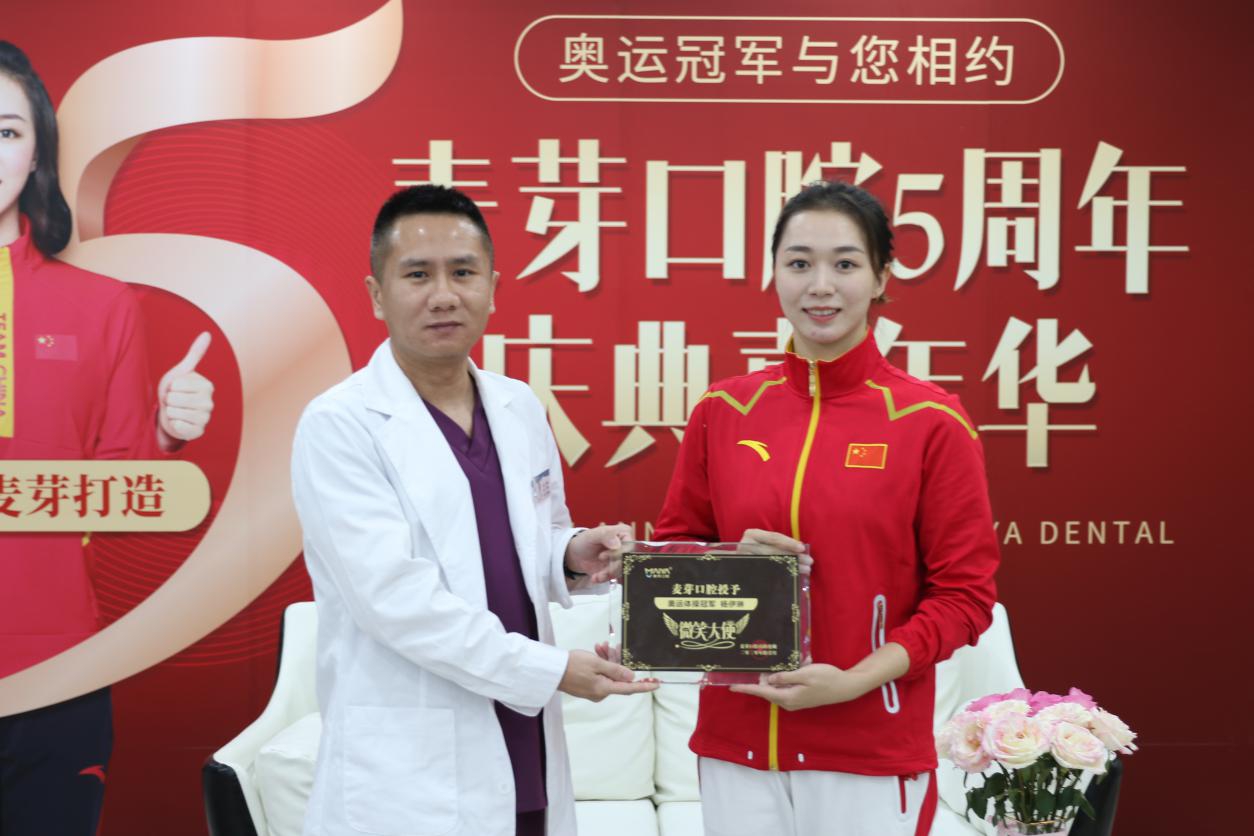 麦芽口腔品牌连锁福田机构业务院长李泓甫为杨伊琳颁发“麦芽口腔微笑大使”牌匾