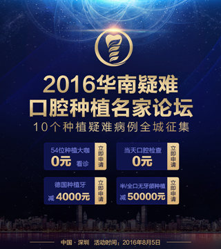 为攻克种植难题,加强行业交流,2016年8月5日,国际口腔种植医师学会(ICOI)、深圳分会联合麦芽口腔、美国ZIMNER共同主办 “首届“华南疑难口腔种植名家论坛””,聚集国内种植牙名家,研讨当前高难度口腔种植修复方案。同时,向全市征集10个种植疑难病例,可点名享受种植大咖0元看诊,当天口腔检查0元。